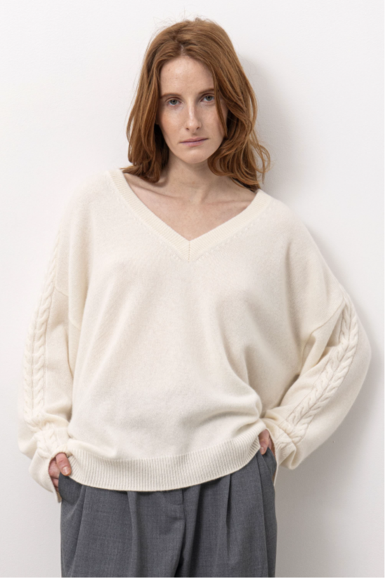 カシミヤ100%、フリーサイズ、袖にケーブル柄編み仕様
