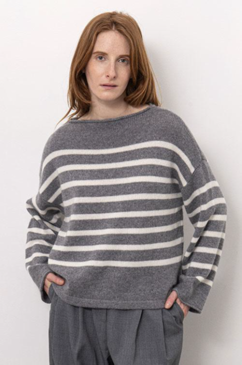 洗練されたボートネックデザインと、目を引くボーダー柄が特徴のカシミヤプルオーバーです。シンプルながらもスタイリッシュな印象を与え、コーディネートの幅が広がります。